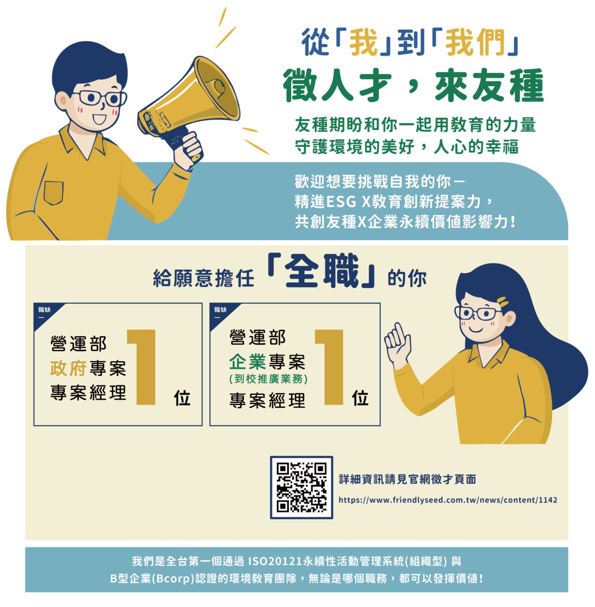 1.學歷條件:學士以上,環境/自然/人文/教育/永續相關科系,3年以上相關工作經驗。或學士以上,不限科系,相關工作經驗4年以上。
