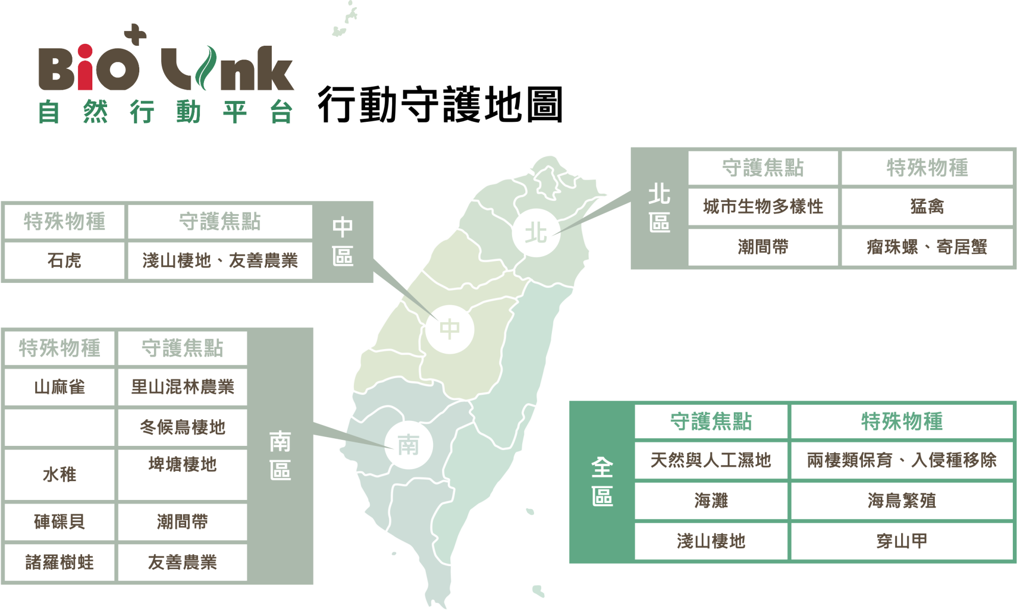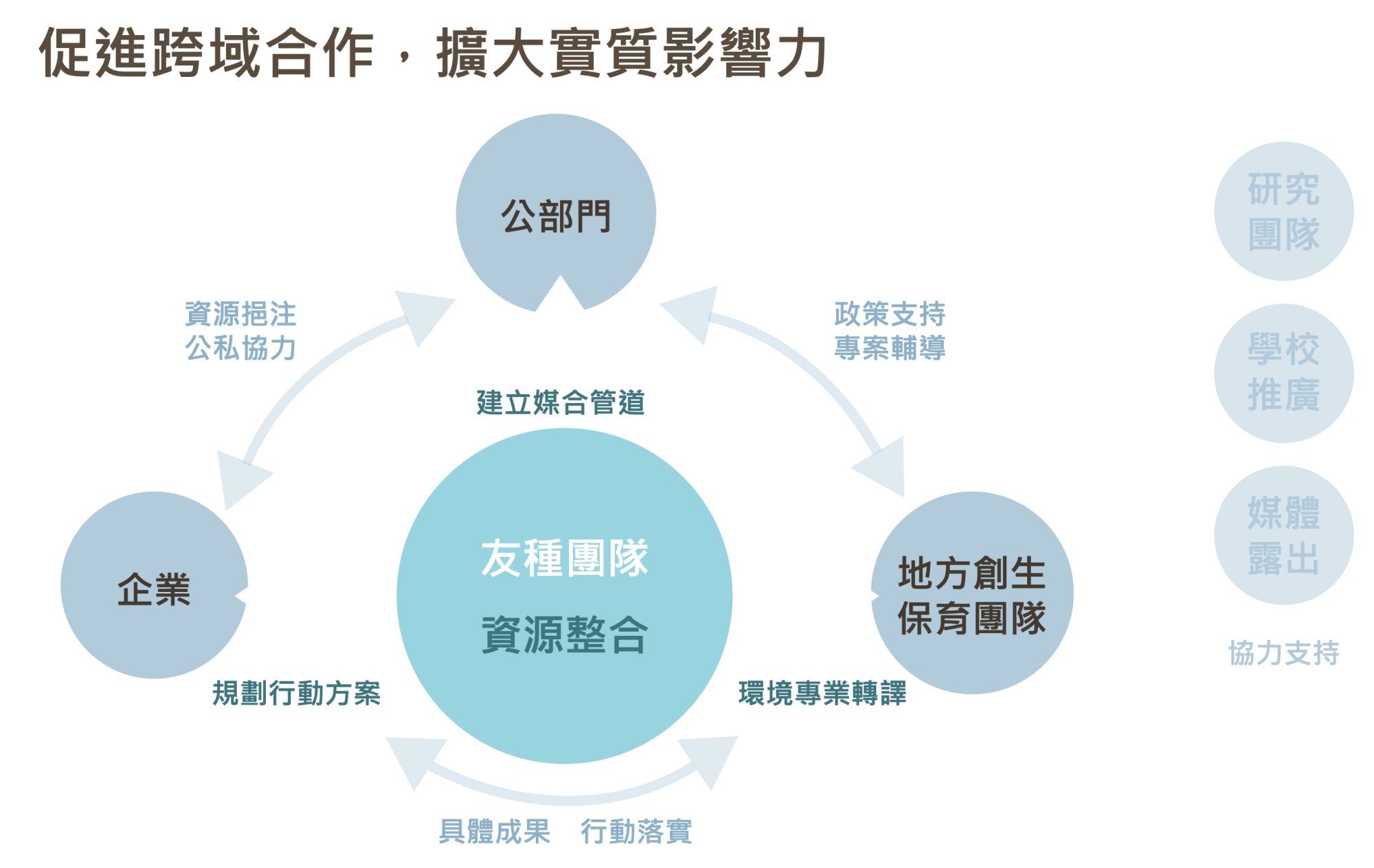 此外,平台亦致力於打造跨域對話與合作的平台,促進企業、學界、保育組織、學校與公部門之間的交流與連結,強化資源整合並激發創新保育行動。