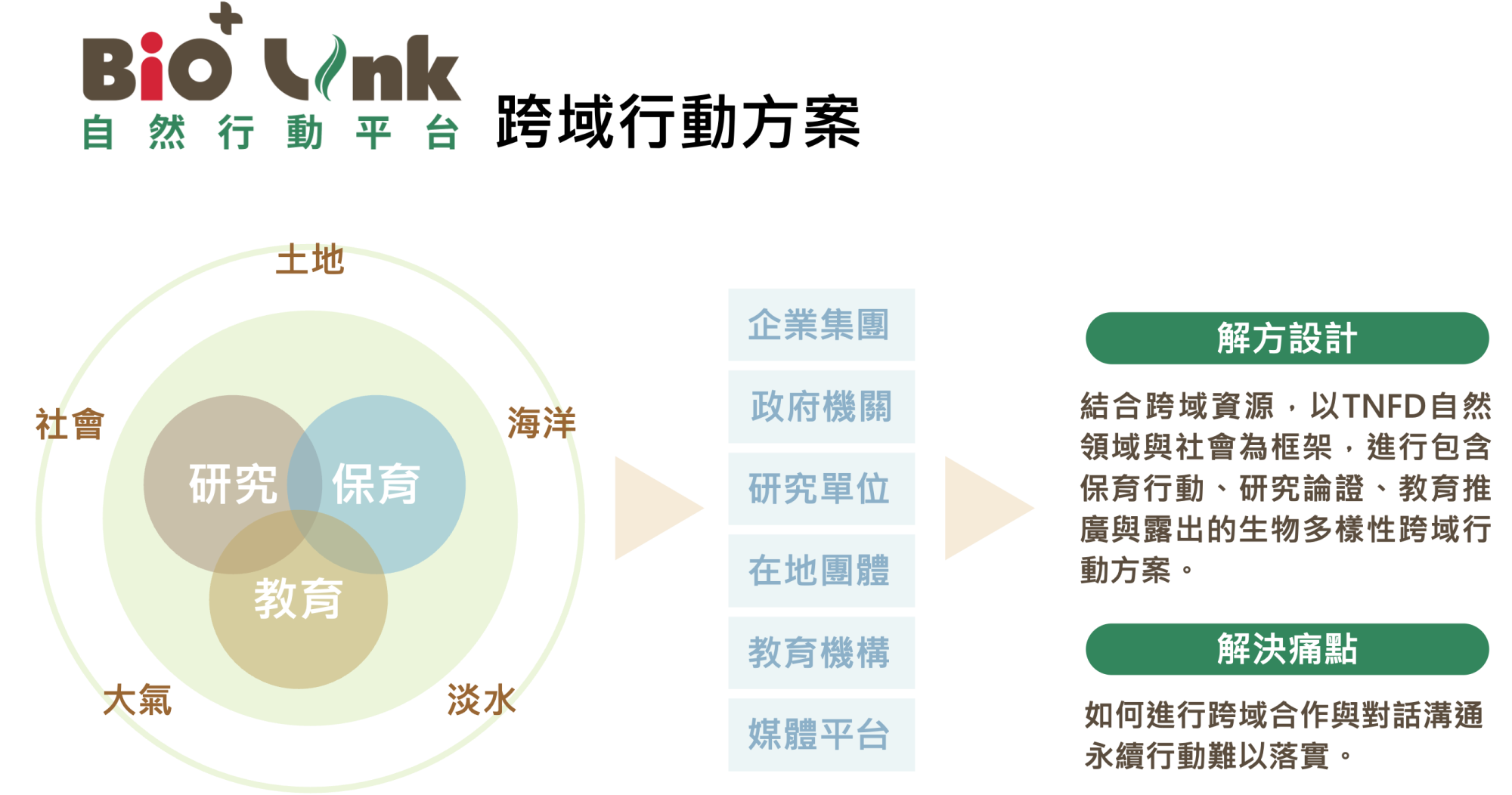 在實務運作上,Bio⁺Link強調「從理解到行動,創造影響力」的完整歷程。平台透過教育與溝通,提升企業與員工對生物多樣性的認識,建立內部共識並深化為企業文化,並進一步透過教育推廣與公共倡議,擴大社會影響力,讓更多利害關係人理解並參與保育行動;同時,透過專案設計與跨域媒合,連結企業資源與在地保育需求,如物種保護、棲地復育與生態調查,將理念轉化為具體行動;並藉由數據化與指標工具,將投入轉化為可追蹤與可揭露的成果,強化永續報告與利害關係人溝通的可信度。