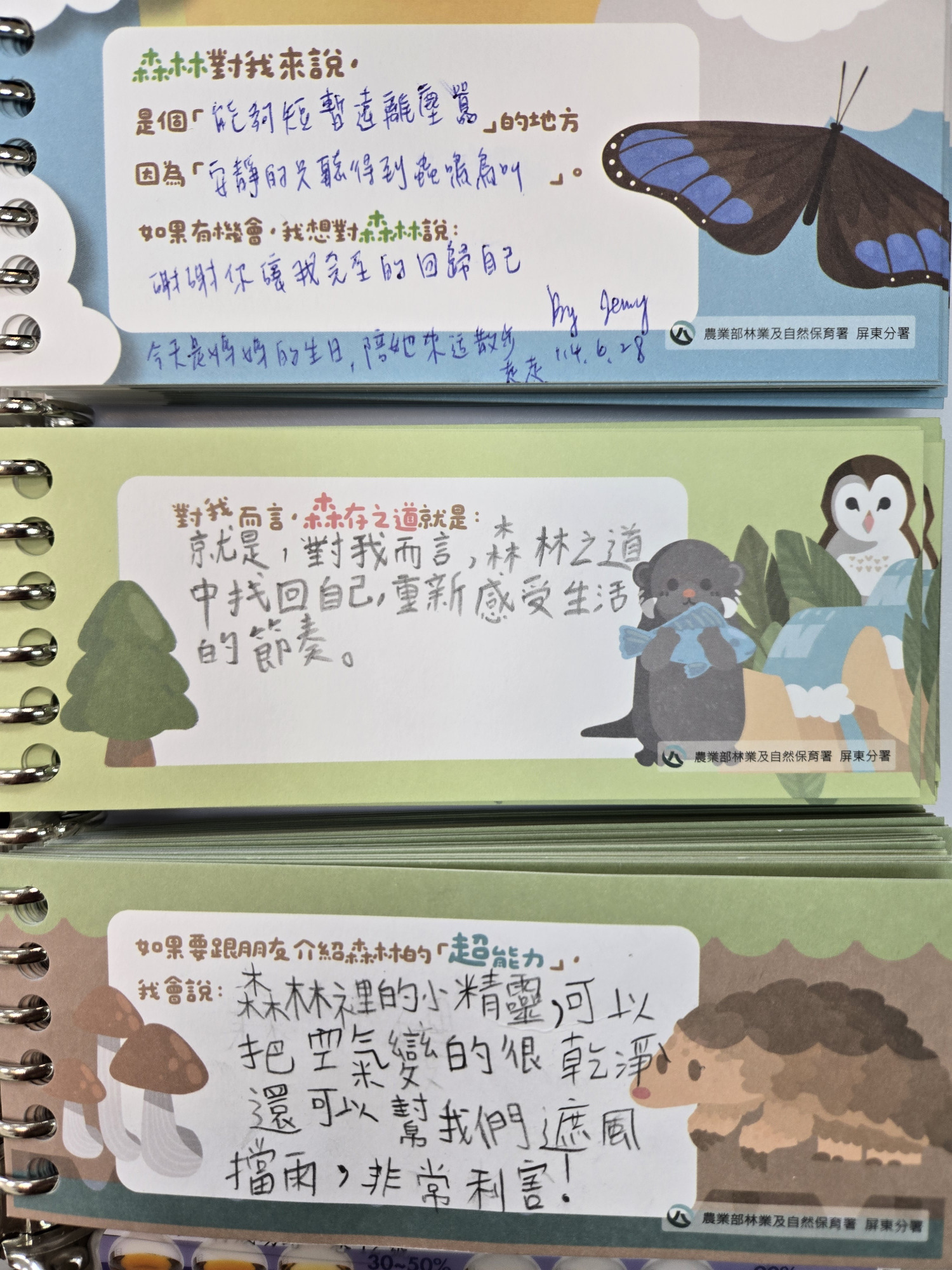 為了增進與民眾的互動,我們在書展期間設置了《森林對我來說》共創文學區,開放路過民眾撰寫小卡來抒發自己對森林的感受。原本擔心大家會害羞或懶得書寫,沒想到活動結束時,小卡的數量突破三百張,涵蓋大人與孩子的真誠回應。有人寫道:「森林是個能讓我短暫遠離塵囂的地方,因為安靜得只聽得見蟲鳴鳥叫。」也有人想像:「森林裡的小精靈,可以把空氣變得很乾淨,還能幫我們遮風擋雨。」這些溫暖的文字被集結成共創小冊,陳列在書展區,集合大家對森林的共同回憶。