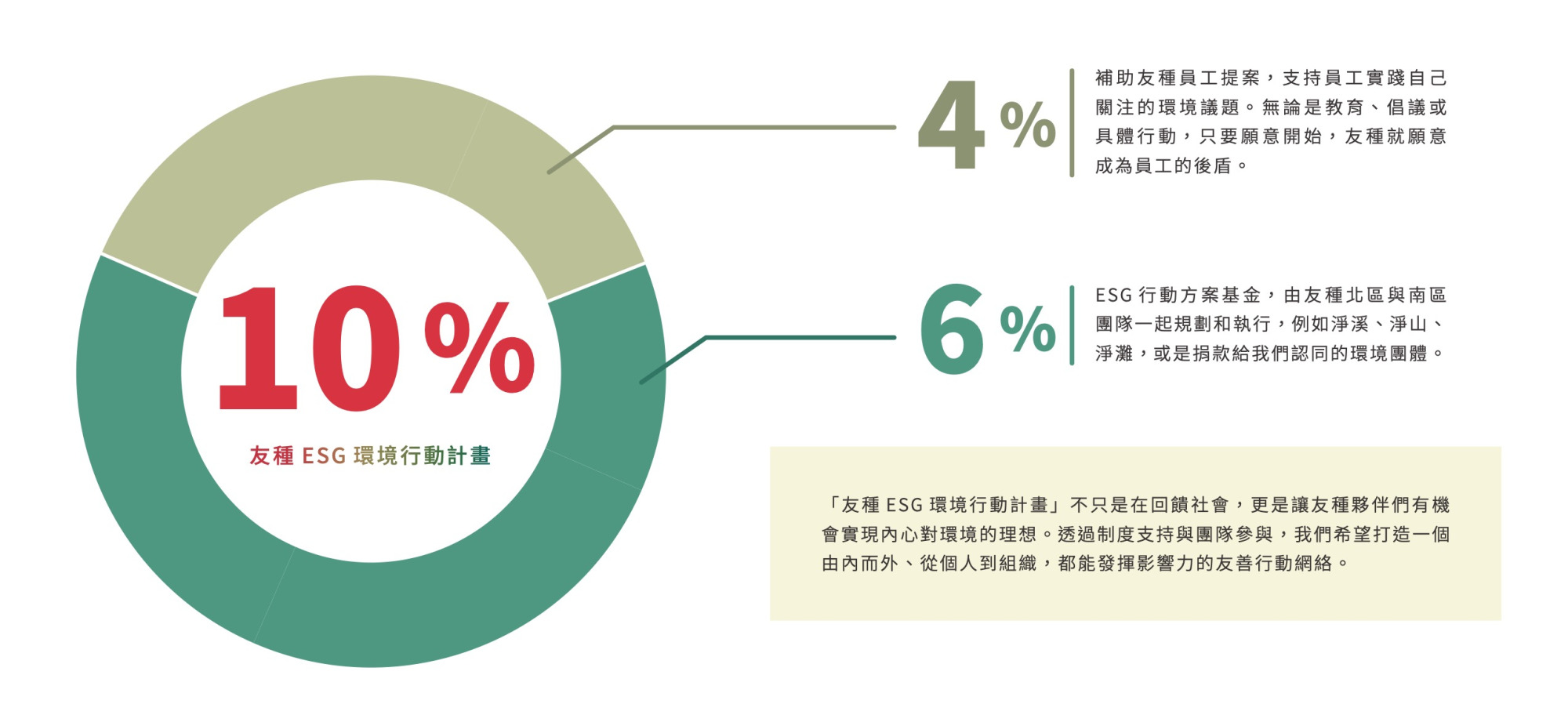 友種持續內化「B型企業」的精神、實踐ISO 20121的社會面目標,將獲利轉化為社會影響力,推動ESG環境行動計畫,將每年稅後盈餘的 10% 作為社會回饋,其中 6% 投入公司 ESG環境行動日的方案基金,邀請全體員工身體力行回饋社會,包含棲地營造、農地土讓診斷、寄居蟹保育等(另 4% 支持員工實踐自己關注的環境議題,迄今已促成友善果園、親子共耕等多項具有在地文化與環境價值的跨領域專案),讓每位夥伴不僅是專案執行者,更是永續行動的共同倡議家。