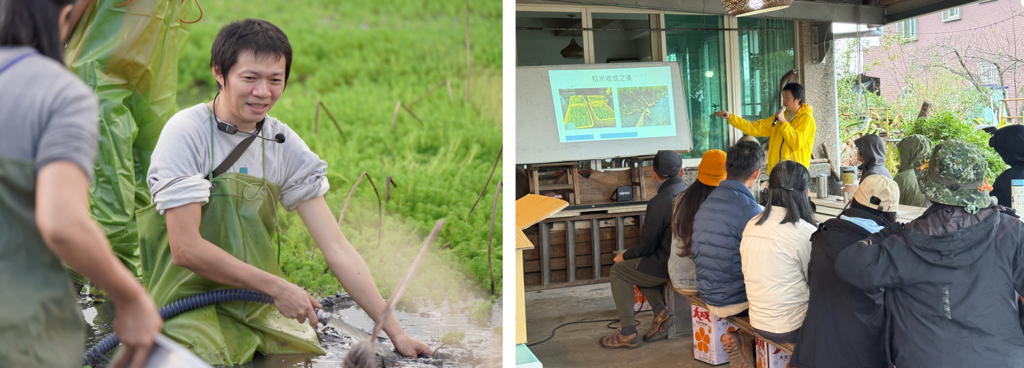 抵達現場後,夥伴們換上青蛙裝、踏入滿是陽光與泥香的蓮田,在禹勛的帶領下,協助其採收蓮藕(挖蓮藕)、清洗與挑選。透過禹勛的分享,我們更深入了解永續農業的核心價值,即是尊重自然循環、珍惜在地品種與生態平衡,從稻米的選種、栽培到收成,每一個環節都蘊含著「人與土地共生」的精神與哲學。